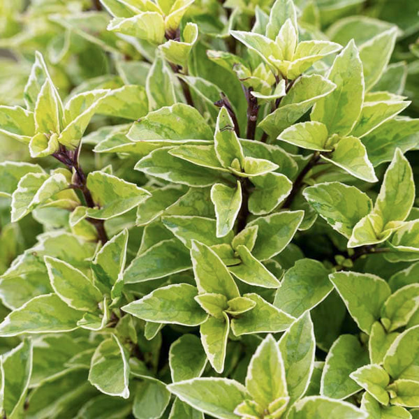 Aromatisk ettårig basilika med upprätt växtsätt och friskt gröna, ganska stora blad med en tydlig gräddvit kant. Blommar med vita, lätt rosatonade blommor.